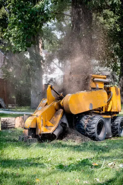 Our commercial stump grinders reduce the stump and surface roots to wood chip mulch, 6–8 inches below the surface. For stumps near foundations, patios, or irrigation systems, we use smaller precision grinders to protect surrounding structures.